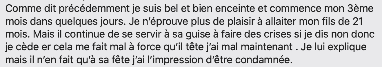 Vous pouvez également choisir de sevrer votre enfant avant la naissance. Cela peut être motivé par une fatigue importante, des douleurs, une envie de faire une transition en douceur, ou simplement une évolution naturelle du lien.