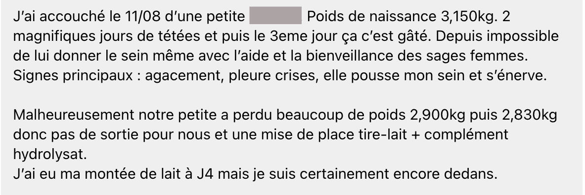 Dans une récente publication, le Dr Pamela Douglas dont j'admire profondément le travail et la rigueur, traduisait explicitement ma pensée : "Je suis profondément préoccupée par le système et la culture actuels de l'allaitement maternel. Non seulement en raison de l'augmentation des interventions et des opérations chirurgicales, dont les résultats ne sont pas concluants, mais aussi en raison de l'augmentation du niveau de stress et de honte imposés aux mères courageuses et déterminées qui finissent par devoir arrêter d'allaiter.