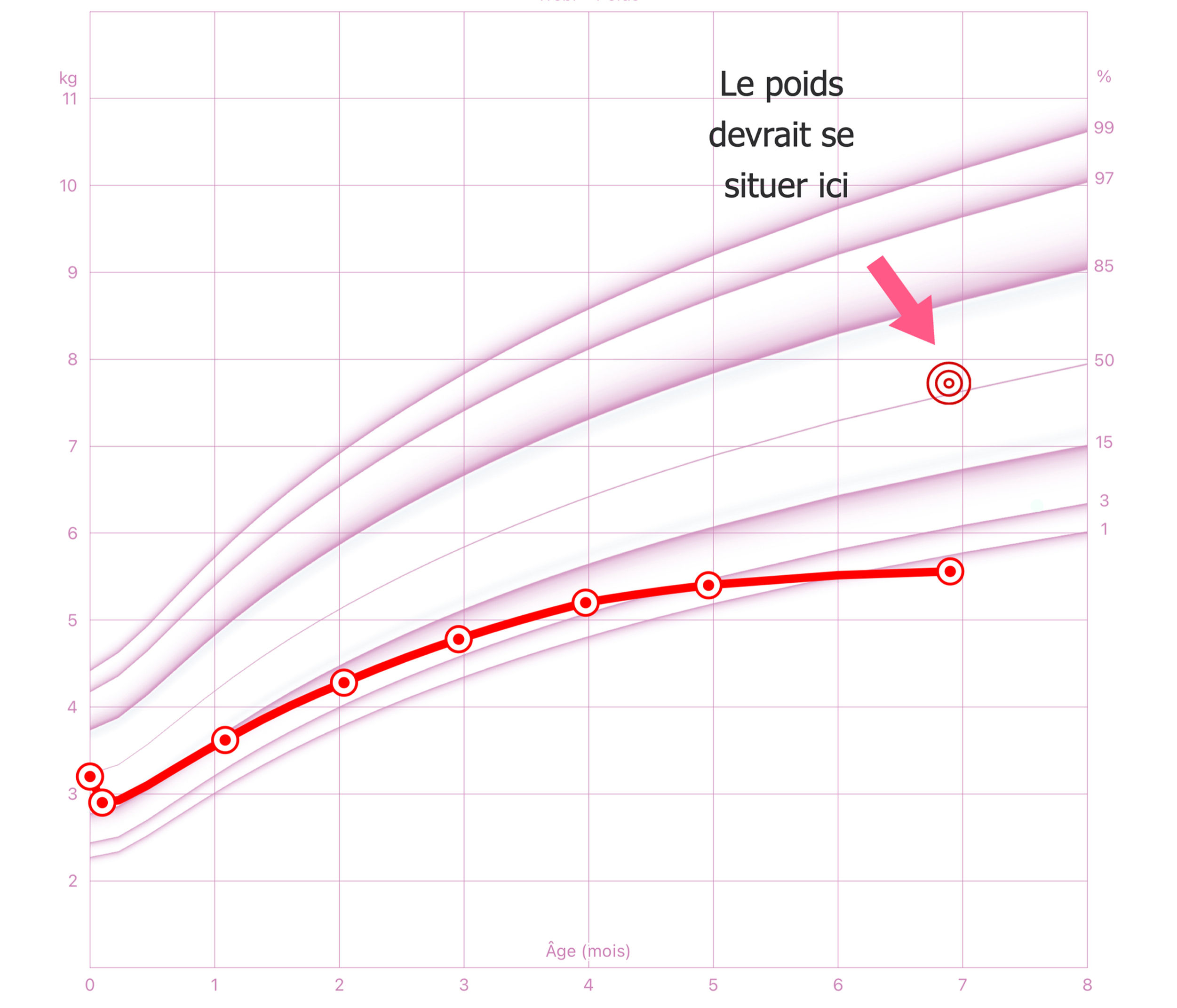 Le nombre de tétées est très élevé, mais le poids ne suit pas : le bébé ne parvient pas à extraire ce dont il a besoin.