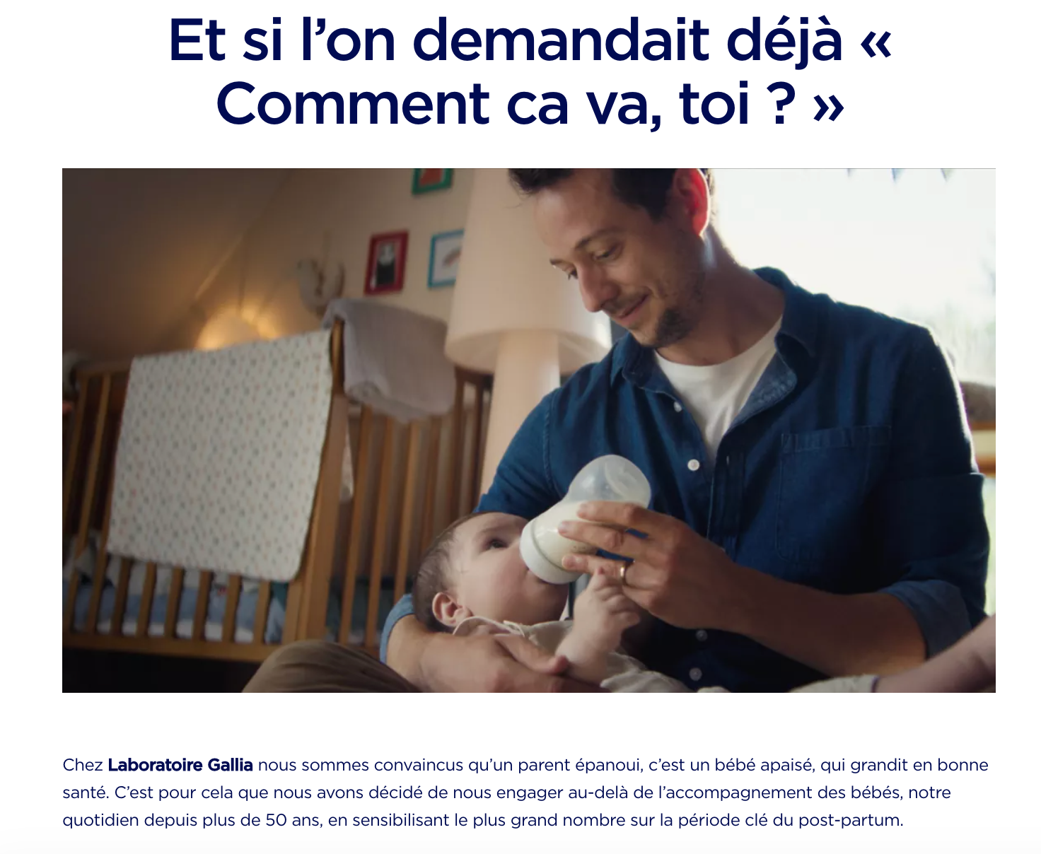 Le site du Laboratoire Gallia illustre cette logique dans une camapgne particulièrelent bien ficelée dont voici un exemple : un papa souriant donnant le biberon, accompagné du titre : « Et si l’on demandait déjà ‘Comment ça va, toi ?’ ».