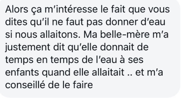 L’eau ne contient pas assez de sodium et bien évidemment ne lui fournit pas les précieuses calories dont il a besoin sur la journée. Son petit estomac sera rempli d’eau ce qui peut altérer son appétit. La tétée suivante pourrait alors être retardée ou écourtée et vous pourriez souffrir d’un engorgement puis d’une baisse de lactation. Répéter les biberons d’eau peut porter préjudice à la bonne prise de poids de votre bébé.