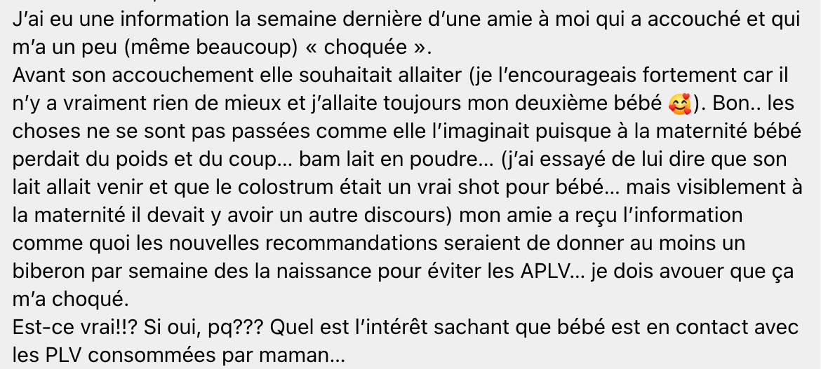 Les hydrolysats contiennent des protéines de lait de vache fragmentées, rendant leur potentiel allergisant bien plus faible. D’autres alternatives proposées par certains spécialistes incluent des PPN à base de protéines de riz, bien qu’aucune étude formelle n’ait confirmé leur efficacité en prévention de l’APLV, ou encore des préparations à base d’acides aminés, où les protéines sont totalement décomposées. En pratique, cette recommandation vise à limiter au maximum l’exposition précoce aux PLV entières, et dans les rares situations où un complément est indispensable, à orienter vers des formules adaptées. Certaines maternités suivent déjà ces recommandations, mais dans le cas contraire, des solutions pratiques existent pour que les parents puissent obtenir un hydrolysat ou une formule alternative.