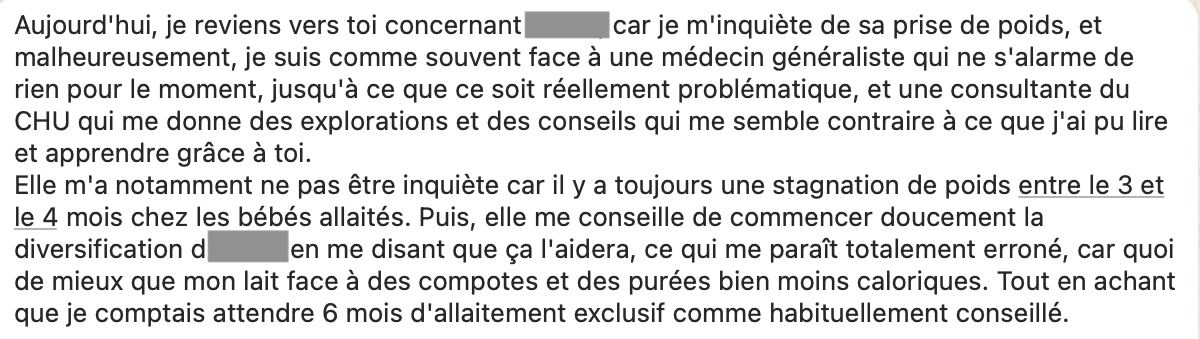 Certes, on observe un ralentissement dans la prise de poids mensuelle des nourrissons à partir de 3-4 mois, et c’est pour cela que la courbe de l’OMS affiche une courbure douce. Mais considérer qu'un fléchissement de la courbe est normal et attendu chez un nourrisson allaité est complètement faux.